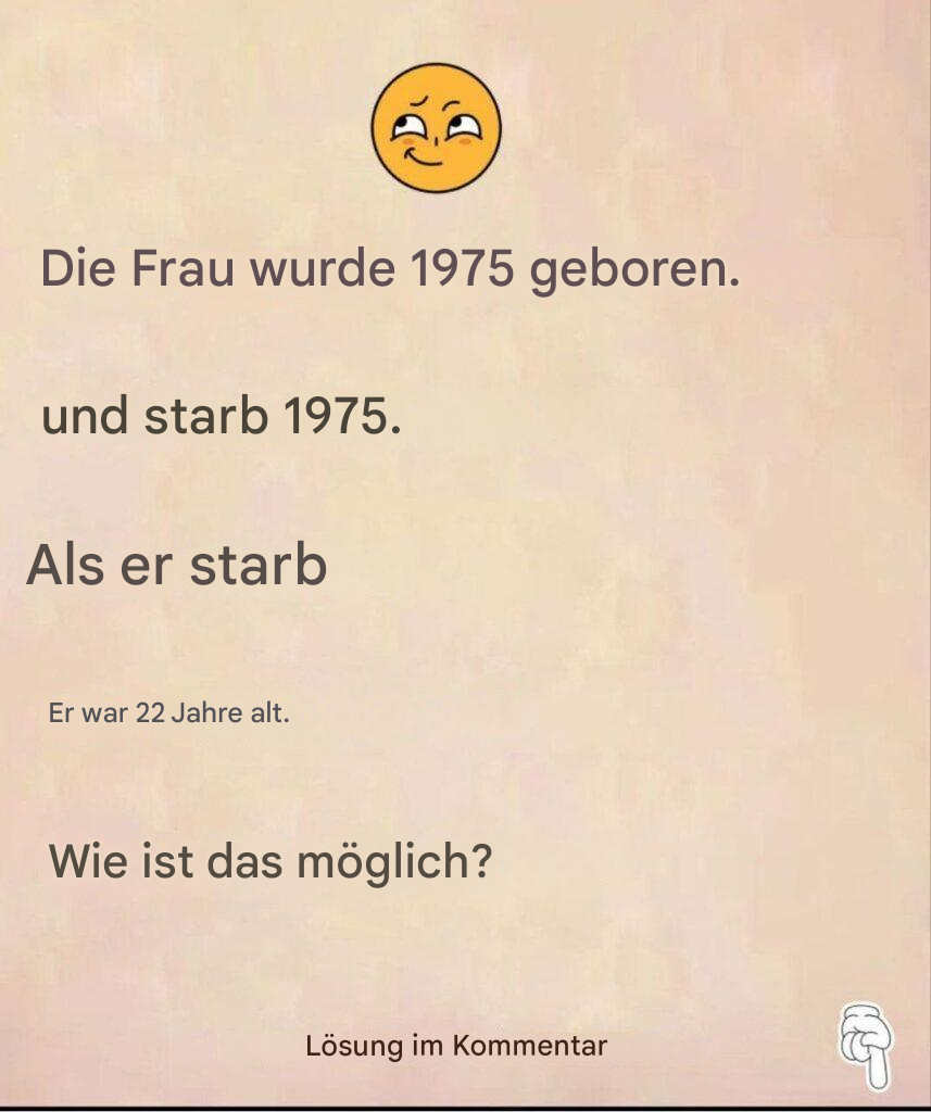 Der erste Satz erscheint unlogisch: Die Frau wurde 1975 geboren und starb auch 1975, aber wäre sie dann 22 gewesen? Außer man ist Zeitreisender (und selbst dann!), scheint das unmöglich. Also suchen wir natürlich nach Erklärungen. Ein Tippfehler? Ein anderer Kalender? Wir verkomplizieren die Sache … dabei ist die Antwort viel einfacher, als wir denken.
